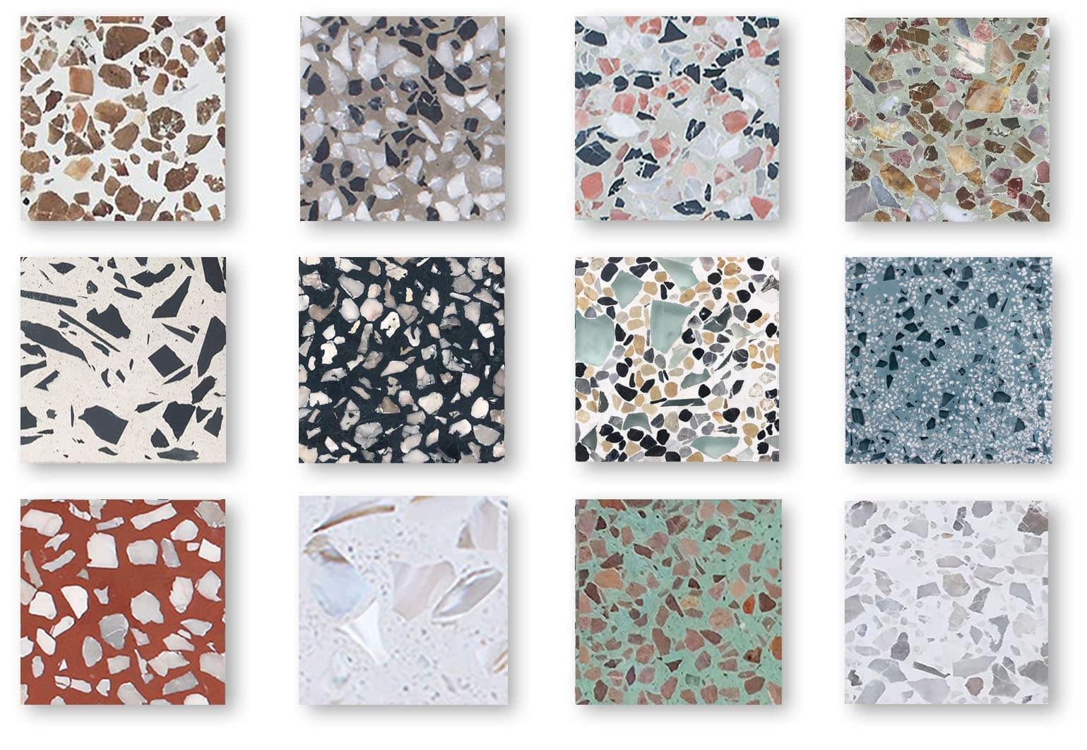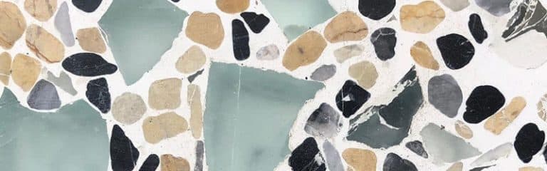 Echte Terrazzo- Bodenbeläge mit geschliffener Oberfläche aus Gesteinskörung. Sie können gemustert oder einfärbig sein, mit verschiedenen Korngrößen, sowie Granit-, Marmor- und Glasstücken.
